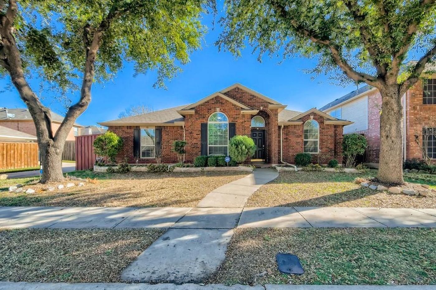Welcome to this 4 bedroom, 2 bathroom home in a lovely neighborhood near Lake Lewisville! As you enter the front door, a short hallway will guide you to the spacious kitchen, formal dining room, and living area. The eat-in kitchen includes an island with a skylight above, an abundance of cabinet space, and sweeps out to the living room with a fireplace. The primary bedroom features a large closet with built-ins and an en suite bathroom boasting a double sink vanity, a garden tub, and a separate glass-enclosed shower. Enjoy an afternoon entertaining on the covered patio that overlooks a lush backyard. Nearby schools, parks, community pools, and the shoreline trail!