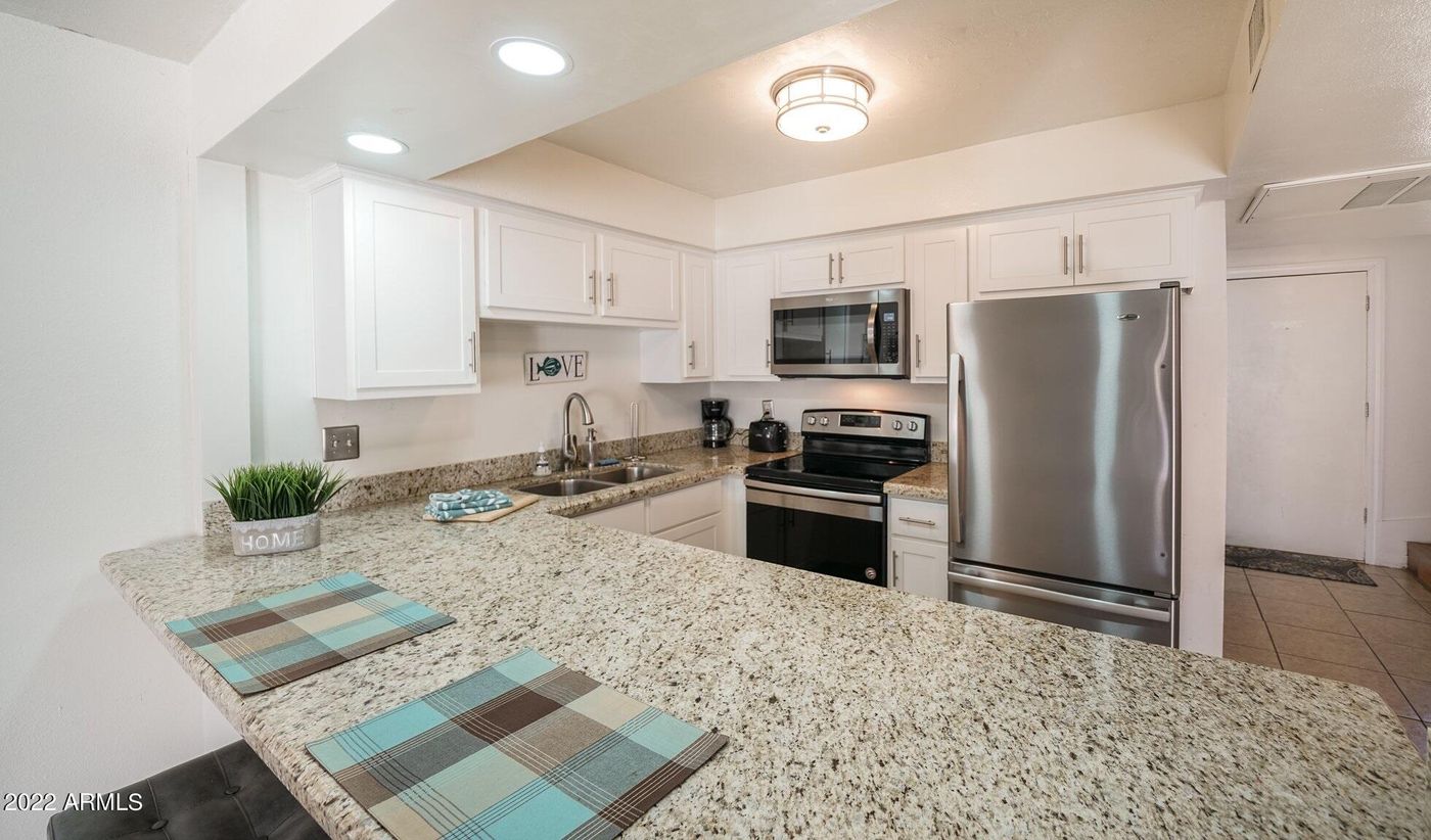 Charming 2 bedroom townhouse in one of the best locations in Central Phoenix! Interior paint just completed! Open and bright the downstairs features a remodeled kitchen with white cabinets , granite counters, stainless appliances, neutral tile throughout and a sliding glass door leading out to a private patio. Upstairs offers two large bedrooms with plenty of closet space that share a bathroom. Minutes away from 51 freeway, award winning restaurants and schools. Biking distance to historic Windsor Square which features an urban vibe and close proximity to a light rail station. *Furnishings convey with sale of home*