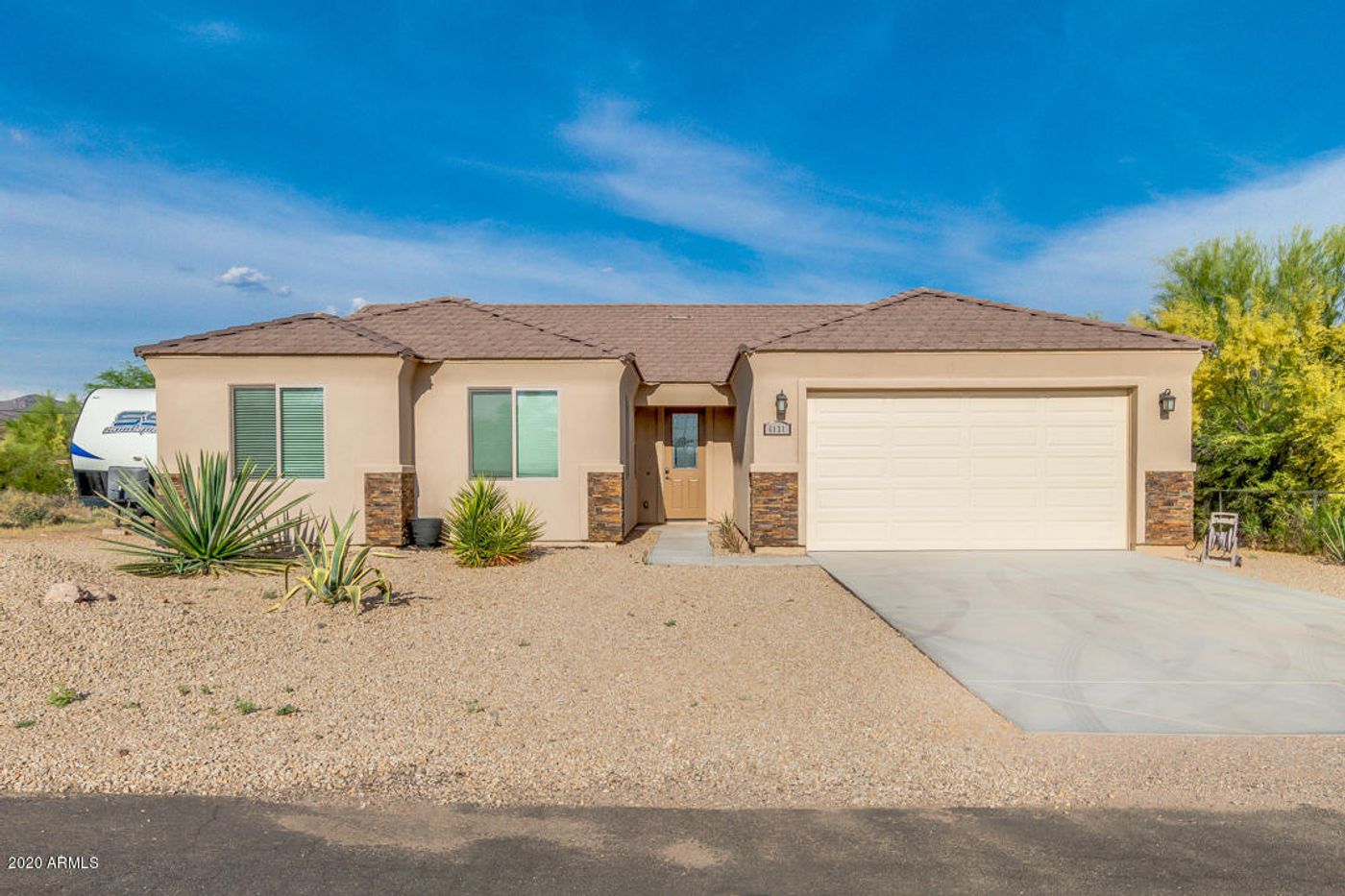 Come see this wonderful single level home in Gold Canyon! This 3 bedrooms, 2 bathrooms home offers desert front yard, stone accents on facade, and 2 car garage. Enjoy entertaining in this amazing open floor layout with neutral paint, wood plank flooring, and vaulted ceilings that add to the spacious feel.