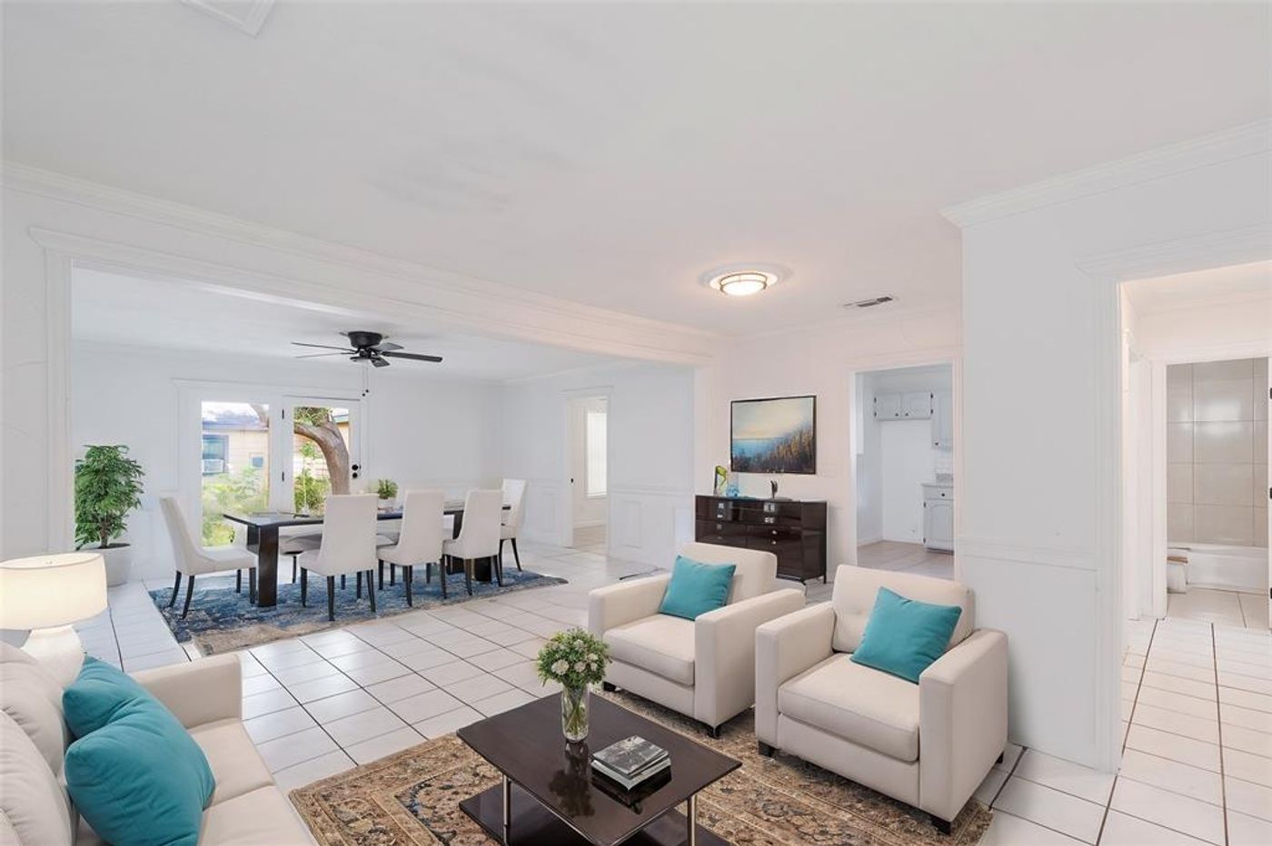 offering both comfort and practicality. Inside, a bright living area awaits, perfect for relaxation or socializing. The