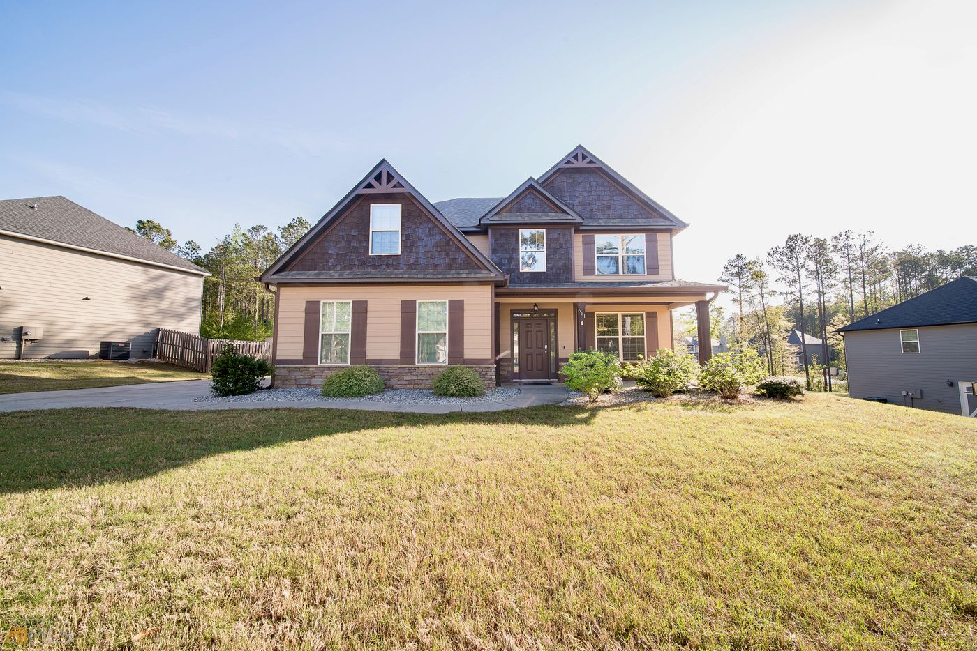 This 2 story Hughston build, Camden floor plan with side entry garage is just 5 years old and meticulously cared for. Two story foyer welcomes you with engineered hardwood floors throughout the main level. Formal dining is accented with coffered ceiling and wainscoting. Arched doorway leads you into an open concept kitchen with ample storage, granite countertops, walk-in pantry, eat at island, and full complement of stainless steel appliances. Breakfast area leads to a covered game day porch with a fireplace. Spacious family room with wood burning fireplace. Half bath, mud space and laundry room also on the main level. Upstairs leads to a large Master Suite w double door entry; bath includes double vanity, soaking tub, tile shower and nice walk in closet. 3 additional bedrooms with hall bath and linen closet. Alarm system. 2 Car side entry Garage.
