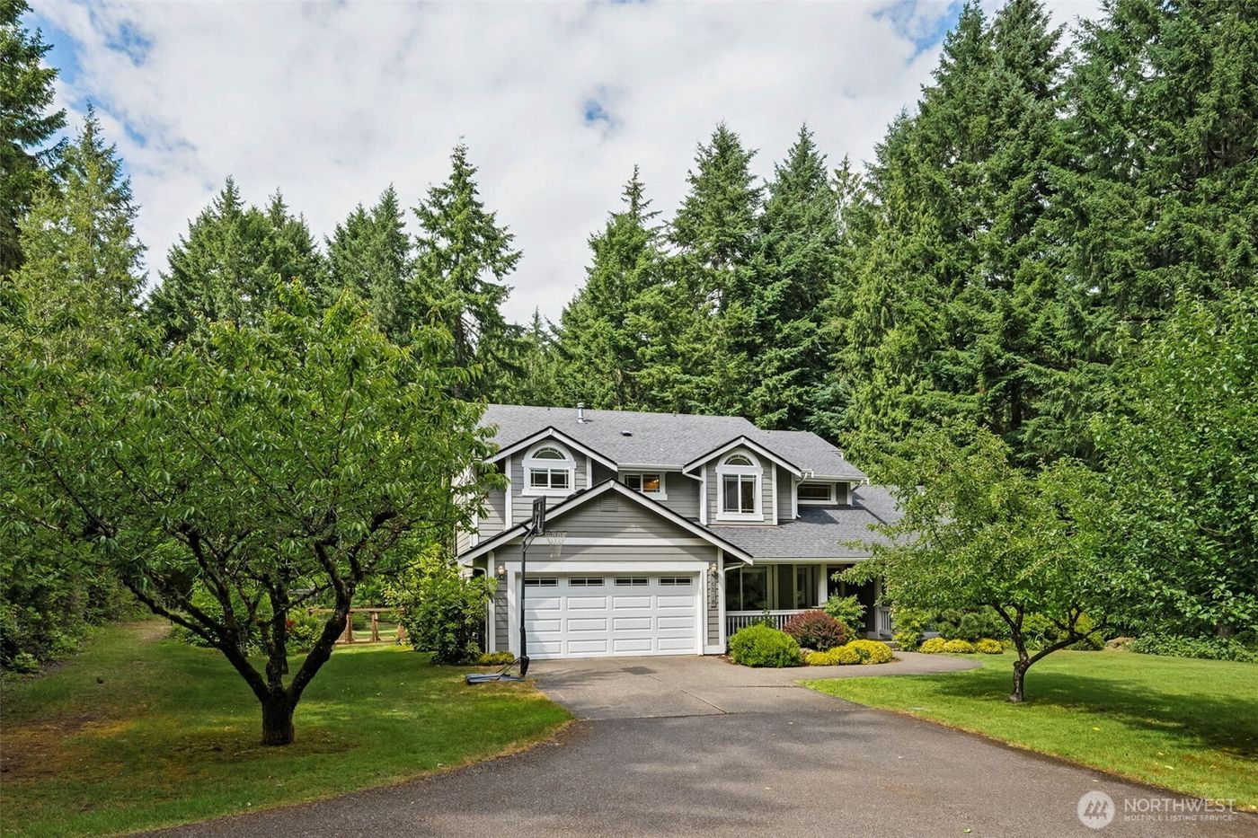 Modern Updates & Privacy? Yes please! 2+ acres, fully fenced with 2,626 sf recent remodel shows serious attention to detail. Vaults, river rock wood FP +wow wall of windows gives a signature moment, while refinished oak hardwoods anchor the design. Quartz counters with modern 2-tone cabinets & upgraded fixtures shine. 2 walk-in closets in MAIN FLOOR primary & jetted tub that’s ready when you are. Upstairs loft flexible bonus space doesn’t sacrifice aesthetics. Private biking/strolling trails, a curated orchard with cherry, apple, & plum trees, plus a covered patio with skylight makes the most of every season. Newer roof, heat pump A/C, generator wiring, & plenty of parking make it turnkey. No HOA, just thoughtful design & convenient locale!