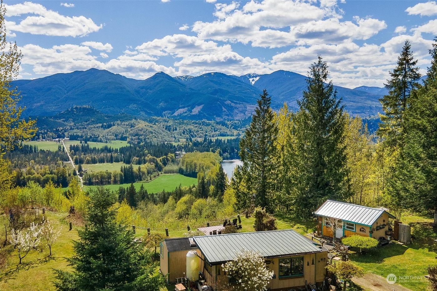 A rare opportunity awaits to own your own compound nestled on 20 acres overlooking the Skagit River, with breathtaking views of Sauk Mountain and Mount Baker. The property boasts a variety of fruit trees including apple, cherry, plum, pear, and peach, as well as enchanting Korean spice trees emitting a delightful aroma. The cabin is connected to electricity, and a 700-gallon water catchment system ensures a renewable water source. Featuring three cabins, a cook shack, and a 14x60 storage container for added convenience. Secluded yet conveniently located just 1.5 miles from town, with easy access to schools, shopping, medical facilities, and recreational areas. Situated only 1.25 miles from Lake Shannon. Schedule your private tour today!