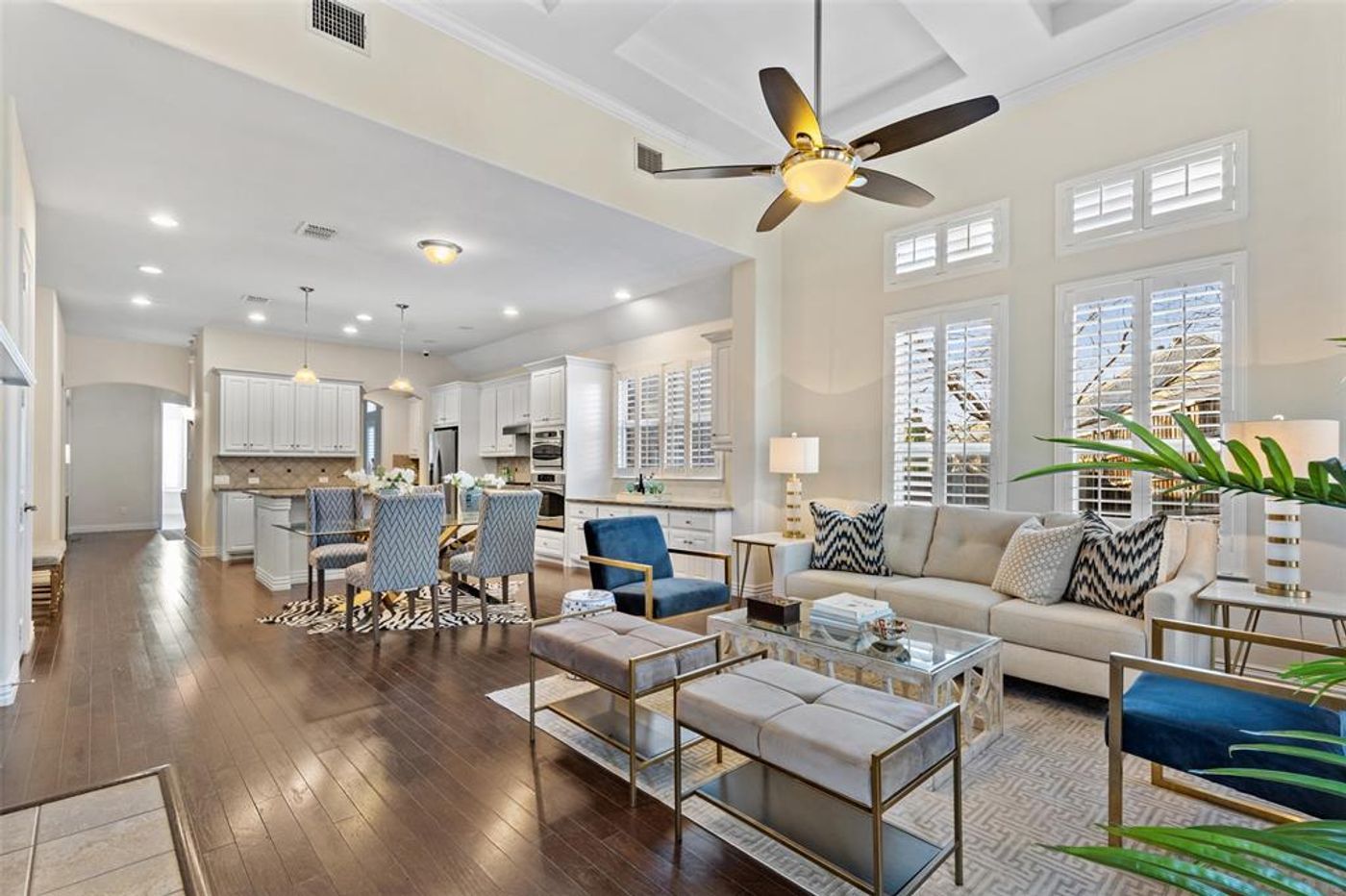 Ready for those personal touches that only a new owner can bring. Fabulous open design floor plan that can afford a home owner many different layouts for entertaining and daily lifestyle flexibility. The lovely entrance with 12 foot ceilings opens to a dramatic formal dining or second living area. A front room with glass French doors can work as an office or tv room. The homes great room flows from two arched entries and is part of an island kitchen. Plantation shutters along with extensive crown and floor moldings, faux transom windows add natural light along with privacy. The backyard is a private oasis with covered stone patio and beautifully landscaped. All one story, large primary bedroom make this an exceptional find.
