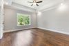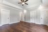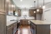 Meticulous craftsmanship shines in every detail, from the crown molding to the custom trim work. All three bedrooms are located on the main floor, each with rich hardwood floors. The spacious primary suite features a tray ceiling, recessed lighting, a ceiling fan, walk-in closet, and an en-suite bathroom with a tiled walk-in shower and double vanities.