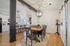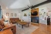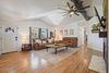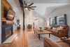 Inside, you'll find an inviting open-concept floor plan filled with natural light and designer details. Soaring black-beamed ceilings make a bold statement, laminate wood floors offer both style and durability, and a dramatic wood-burning fireplace anchors the living space. The chef's kitchen features white shaker cabinetry, quartz countertops, glossy black appliances, and a large island perfect for gatherings and entertaining. The primary suite is a true retreat with a spa-style bath that includes a soaking tub, oversized tiled shower, and dual vanities. Two additional bedrooms provide flexibility for guests, a home office, or creative use, with one offering a walk-in closet.