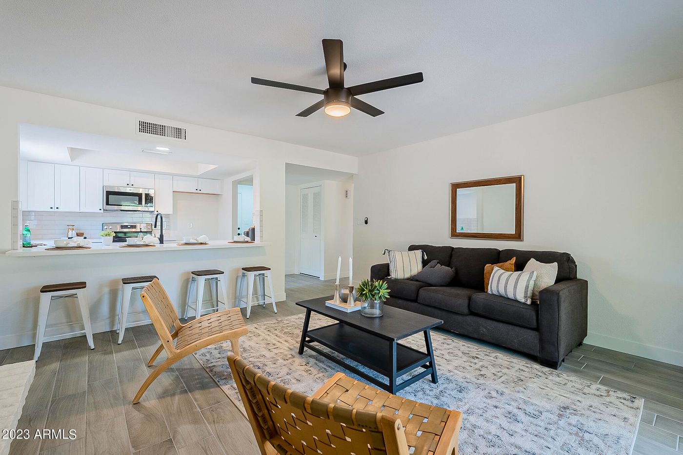 This Stunning 3 bedroom, 2 bathroom home sits on a golf course view lot. Prime South Tempe location just minutes away from Shopping, schools & freeways. The interior boasts a functional layout with formal living/dining room, Designer palettes, wood plank tile flooring & fixtures you'll love! The kitchen is equipped with white shaker cabinetry, quartz counters, stainless steel appliances plus a peninsula w/breakfast bar seating. Adjacent family room features a fireplace & golf course view. Primary suite has 3/4 ensuite & walk-in closet. Enjoy your low maintenance backyard with magnificent sunset views, covered patio & RV Gate add to its appeal, making it a charming home for anyone. Schedule a showing today! Golf Course Backyard View Fence to be completed 8/3.