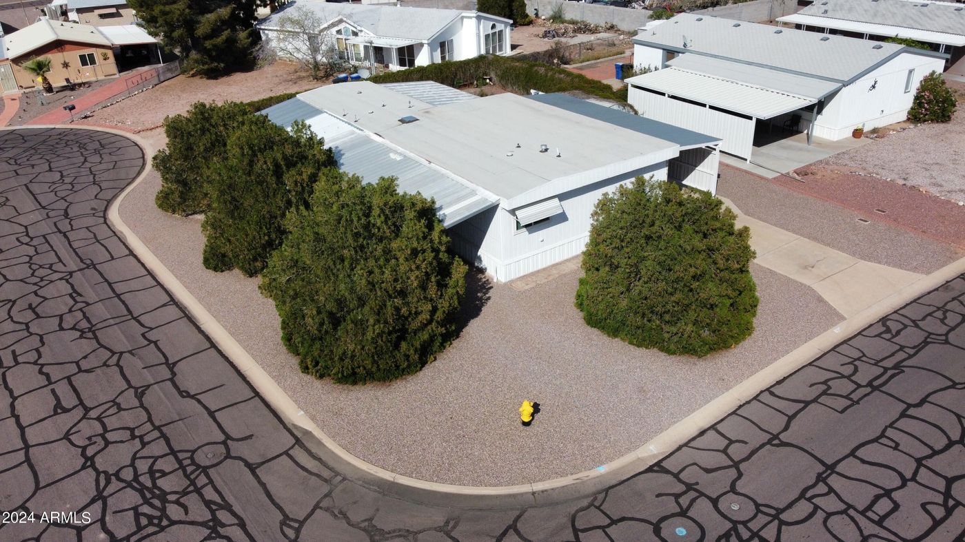 Move-in ready! Take advantage of this affixed mobile home in the corner lot of a peaceful cul-de-sac, in a golf course community, with no HOA. This gem offers a front porch, 4 carport + add'l slab parking, and new AC & furnace. Inside, you'll find a living/dining room with tall ceilings, neutral palette, graceful archways, and tile/wood-style flooring. The family room with backyard access is perfect for gatherings. The kitchen includes functional appliances and wood cabinetry. Main bedroom has a private bathroom, secondary bedrooms share a Jack & Jill bathroom. Enjoy the covered back patio, attached workshop, and shed in the tranquil backyard—ideal for BBQs!