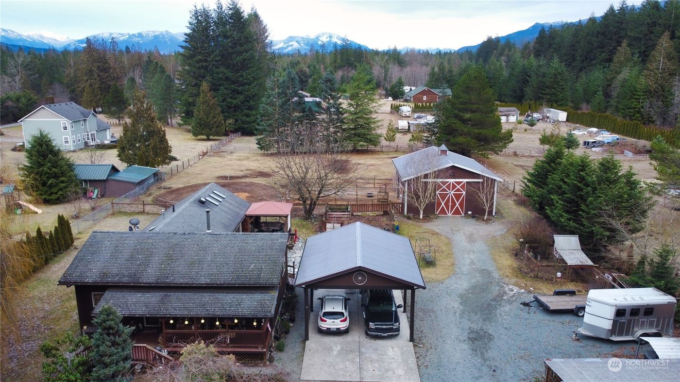 Country Rambler w Barn on 1-Acre in Desirable Birdsview Area. Enjoy the Upper Skagit Valley and all that it has to offer in this warm and inviting one-level residence. Open lofted great room w island kitchen, upgraded SS appliance set, cozy wood stove, large laundry rm and guest bed & 3/4 bath. Huge vaulted primary suite w luxurious bath, 2 closets, skylights and slider to a private covered deck. Patio area w water feature for outdoor living. Along with the home, there's a newer Spane-built 3-stall barn w loft and shop area a quaint gar/shop and 2-car carport adjacent to the home. The spacious acre is fully fenced and has a gated entry. Bring your horses, everything is all set up and ready to go. Chicken coop, RV/trailer parking and space.