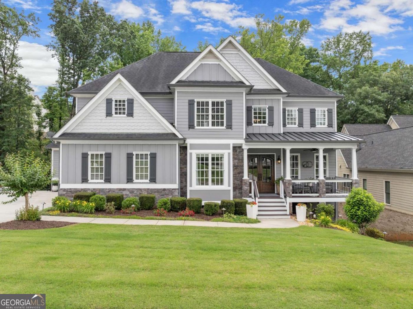 Welcome to your custom built home located in the sought-after River Rock Swim/Tennis Community. This stunning home features Iron double front doors, hardwood flooring throughout home, tiled four season room off the two-story great room, chef's dream kitchen with cabinets and counterspace galore,custom walk in pantry with shelving and full size refrigerator, Butler's pantry/wine/coffee bar, separate dining room, bedroom and full bathroom on the main level and don't miss your deck overlooking your backyard. Walk upstairs where you will find your oversized Primary suite with bath of your dreams. The primary bathroom features custom mirrors with built-in television, garden tub, tiled double sized shower and your walk in closet of dreams-built-in closet system. Two other secondary bedrooms on are the second level-both can easily fit a king size bed. Secondary closets also features closet systems. The finished terrace level includes a full bathroom, bedroom, 12 ft trey ceilings, Kitchenette with sink,refrigerator and kegorator, stunning shiplap wall for television, east in area and walk out to private backyard covered patio. This home also features, 3 car garage, lush landscaping, irrigation system, fire pit in the backyard, AMP landscape lights, built in bench off of the garge entrance, gutter guards, camera system,cul de sac location and more! Enjoy an impressive selection of community amenities, including multiple swimming pools, a playground, a beautiful clubhouse, a cozy fire pit, and courts for both tennis and pickleball. Residents also have access to scenic community areas along the Etowah River. Located within top-rated school zones-Poole's Mill Elementary, Liberty Middle, and North Forsyth High-this home offers everything you need for exceptional family living. Don't miss this home- true pride of ownership.