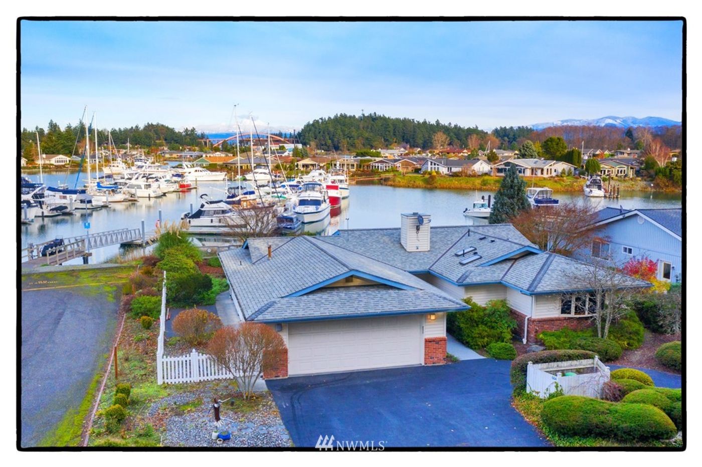 Watch fabulous sunrises over the Rainbow Bridge with Mt Baker in the background in your new spacious bright and sunny waterfront rambler with large windows providing an abundance of natural light. Open floor plan with a spacious deck for entertaining friends. Bask in sun, prepare BBQ’s & enjoy the community amenities which include two swimming pools, tennis courts, golf course, club house, two private beaches, and minutes to the quaint village of La Conner.