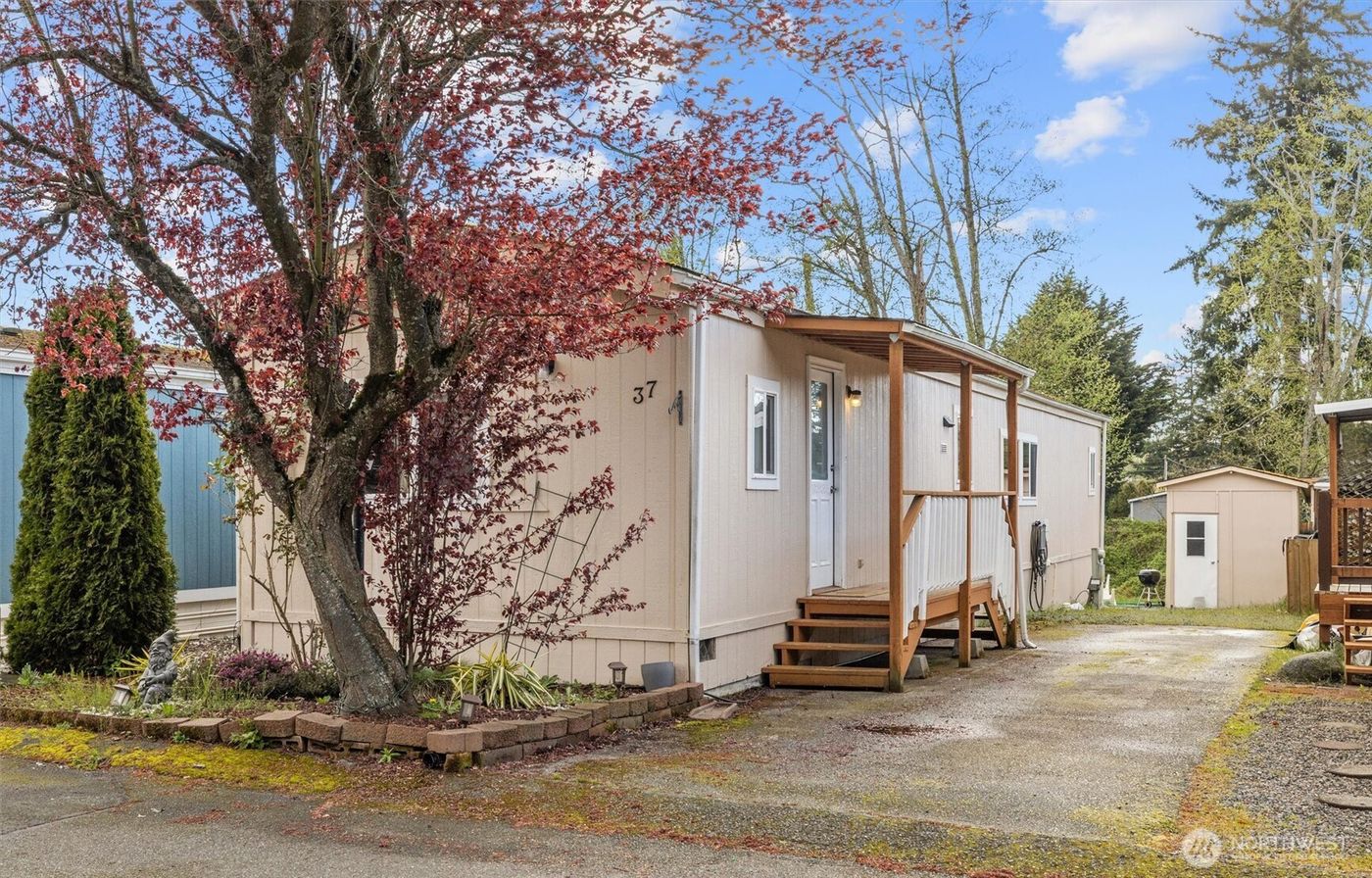 Welcome to your charming retreat in the heart of Loganberry Park, an all-ages community! Step inside to discover a bright, open layout where the living area flows seamlessly into the kitchen featuring sleek appliances and ample cabinetry. Primary bedroom is a true haven, features dual access, a spacious full bathroom with a contemporary vanity, and generous closet space. The second bedroom, thoughtfully positioned for privacy, is ideal for guests or a home office. Vaulted ceiling in the living room for an airy feel, and a full-size laundry area for added convenience. Outside, unwind in the low-maintenance yard and complete with storage shed. Space rent $710/month covers water, sewer, and garbage, making life here as easy as it is enjoyable.