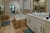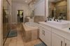 The first-floor primary suite is a serene sanctuary, featuring rich wood plank floors, dual custom walk-in closets, and a spa-inspired bathroom with soaking tub, chandelier, dual vanities, and floor-to-ceiling travertine. A second en-suite bedroom on the main level offers equal comfort and elegance.