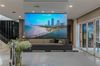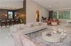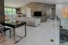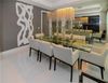 To your right, a spacious formal dining room stuns with 40x40 porcelain tile floors, an extravagant chandelier, and curated décor, including wall art and mirrored panels that reflect the refined aesthetic throughout. The living area is equally captivating, featuring designer furniture, a custom dual-sided media wall, electric fireplace, and sleek LED-lit wood paneling that adds warmth and drama.